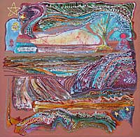 | “Catch a Falling Star.” Batik collage with machine embroidery on cotton stretched onto a wooden frame. 77×76 cms |