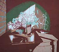 | “Still Life, with Jenny’s Wire Sculpture.” Batik cotton wallhanging stretched onto a wooden frame. 60×58 cms |